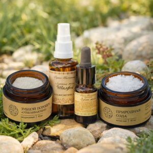 кора дуба, корень аира, мята перечная, природный каолин, розовая крымская соль, чабрец